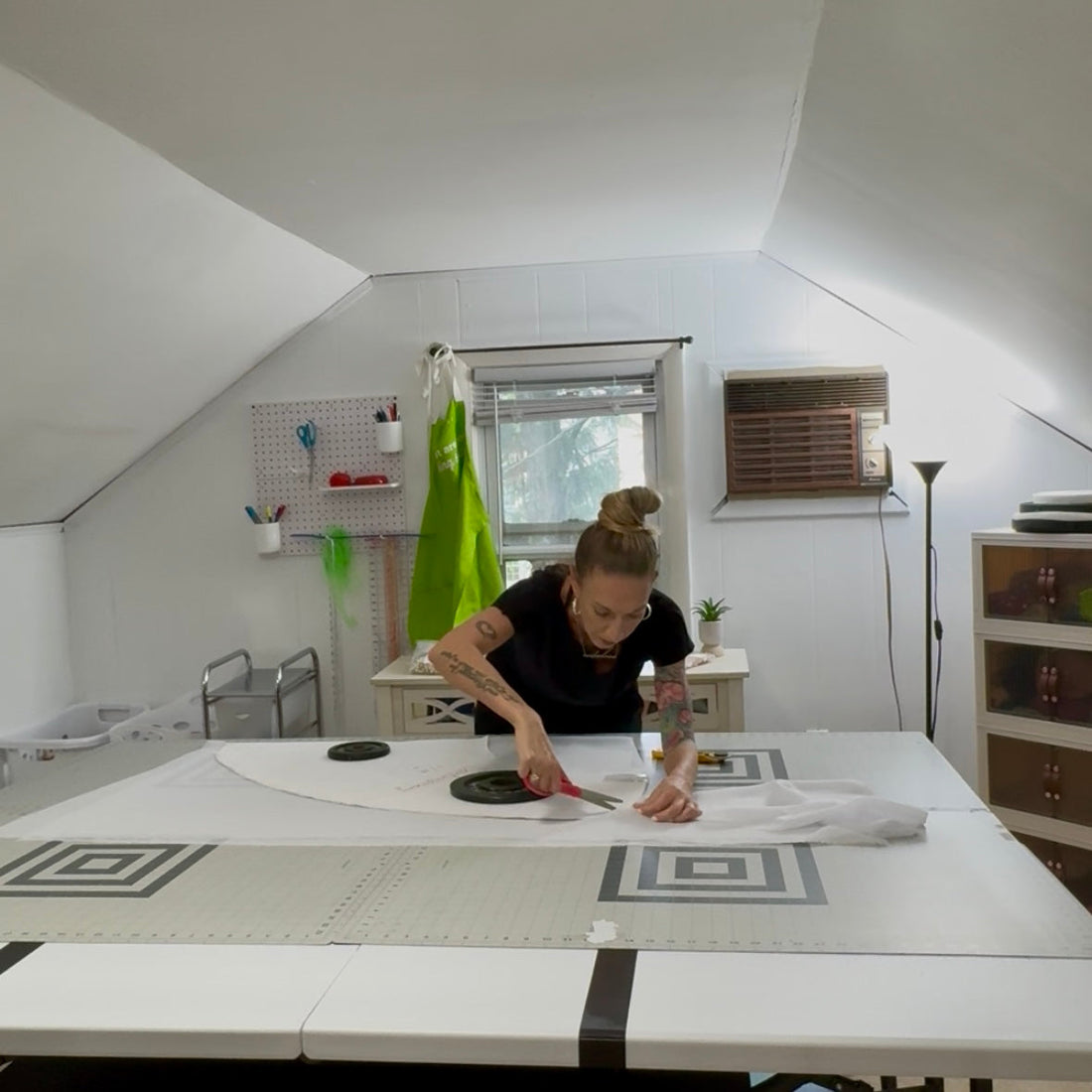 That table was barely big enough to cut even my simplest skirt designs. So I made a swap—I moved our regular kitchen table upstairs and bought a new one for the kitchen downstairs. That worked for a little while… until it didn’t. Some of my more dramatic designs—like the Chiffon Double Pirouette Photo Shoot Skirt, which requires eight panels—were impossible to cut on that table. Every time I needed to make one, I’d have to move the table, clear a space on the floor, carry all my supplies down the stairs, and cut everything on my hands and knees. My back paid the price every single time.
