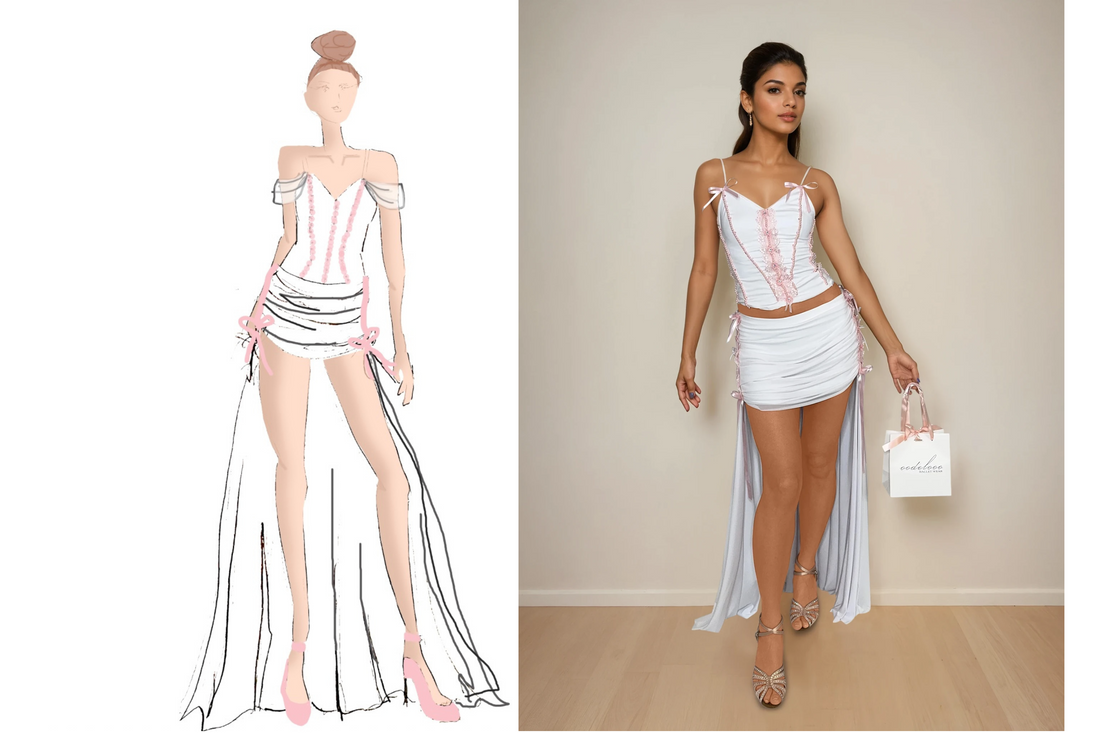 I always begin with a sketch. It's where I get to dream big — exploring silhouette, movement, and mood. This particular design started with an idea rooted in classic ballet lines, but with a touch of bold drama. The sketch captured the essence of what I envisioned, but once I began bringing it to life with fabric in hand, things started to shift.